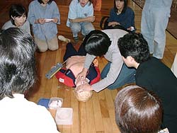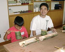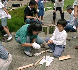 最近、アウトドアブームの中で起きてしまう様々な事故を耳にする機会が増え、その度危機管理能力が問題となる今日この頃。そこで、自然の中で起こりうる事故の防止と対処を知ってもらうため、柴田消防署の協力を得、「野外応急手当講習会」を開催。まずは、危険な動植物の知識と事故に遭ったときの対処法、次に火傷や骨折の応急手当と三角巾の使い方(写真1)、最後に、保護者対象には心肺蘇生法(写真2)、子どもたちには、自然観察時の準備についての学習会を実施しました。講習会終了後、「竹を使った器づくり」(写真3)を行ったところ、普段、刃物を持つ機会の減った子どもたちも竹の特性を学びながら器用に箸を作っていました。出来上がった人から順に自分で作った器に冷やしうどんを盛りつけ、竹箸で食べたのですが、子どもたちの顔がその美味しさを物語っています。(写真4)うどんを口に運ぶとき、ほのかに香る竹の香り、ほとんどの人が初めての体験だったようです。(講師:柴田消防署職員、宮城県森林インストラクター・応急手当普及委員)