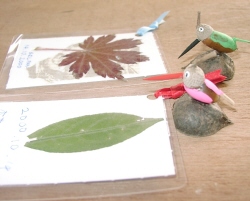 工作で使うツルや木の実などの材料は、ネイチャーゲーム「宝探し」(自然の中の材料を宝物に見立てて捜すゲーム)をしながら採集。午後からは、ドングリや葛ツル、竹を利用した小鳥(写真3)、ツル細工(写真4)、竹笛、木の葉のカード(写真5)、トンボ玉づくり(写真6)の他、除伐材にケーキ種を塗りつけ焼いていくバームクーヘンづくり等盛りだくさんの企画を自分の好きなブースにいって体験しました。