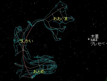 デジカメでいろいろな場所で撮りたかったのに残念ですね!最近はデジカメで天体写真に挑戦していますが、うまく撮れません。皆さんにお見せできるように、もっと修行しま〜す(^-^)ゞ 夕方の西の空に火星・水星・木星・金星・土星が集まっています。水星と金星は月とおなじように満ち欠けがあり、望遠鏡で見ると半月状に欠けているのが観察できますよ。 1.季節の星座・・・おおぐま座こぐま座 先月紹介しました、春の大曲線で登場した「おおぐま座」は、北斗七星(ほくとしちせい)を星座の一部に組み込んでいる大きな星座なのですが、全体を想像するのはたいへんです。北斗七星を身体の一部の尾とすると、その大きさが想像できると思います。 月の女神アルテーミスは、三日月をかたどったかんむりをかぶり、弓矢を持つ狩りの女神でした。おともの中にカリストという娘がいて、女神にしたがって野山をかけめぐっていました。天の大神ゼウスはカリストを愛し、やがてアルカスという男の子が生まれました。ゼウスの后(きさき)ヘラはゼウスのしわざをにくみましたが、その怒りはカリストに向けられました。ヘラの怒りを受けたカリストは、ヘラにあわれみをこいましたが、うでは見る見る黒い毛におおわれ、美しいくちびるも長くのびて、みにくいあごに変わり、出す声もただの太いうなり声となってしまいました。つれていたりょう犬たちもおそろしいクマの姿におそいかかります。カリストは森の奥深くへにげていきました。 それから十数年アルカスは、赤ん坊のころの出来事を何も知らず、母と同じように狩りの上手な若者になっていました。ある日、森にはいったアルカスの目の前に、立ちはだかったおおきなクマがあらわれ、おそろしいうなり声をあげて向かってきました。アルカスはクマに向かってやりをかまえ立ち向かいました。そのクマが、突然あらわれた自分の息子のすがたを見て、うれしさのあまり立ち上がったのも知らずに・・・ 天上で見ていた大神ゼウスは、自分のしたことが原因でアルカスが母に向かうのを後悔し、あわれに思いアルカスもクマの姿に変え夜空の星座にしたということです。 じっさいのくまのシッポは短いですが、星座になるときシッポをもって投げ上げられたため長くのびたとの話もあります。 天体観測をしたことのある方は気がつくかもしれませんが、ゼウスはジュピターともいわれ木星。カリストは木星の月(衛星)の名前で、現在はずっといっしょにいるのですよ。 ![]() 2.今月の星を見る会と、天文現象のスケジュール