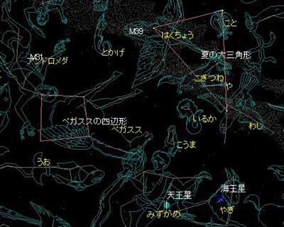 とは、先月のHPの始めの言葉でしたが、今年の天気はどうしたことでしょうね? 台風一過、昼はスッキリとよく晴れあづい夏空なのに、夜はガスがかかって星の見えない夜が多かったようです。 柴田町星見会の夏の行事は、スターウォッチング・サマーナイト2002・星見会定例会を開催していたのですが、雲のあいまから星を見るのがやっとという状況でした。夕暮れが早くなる秋から冬にかけての星空に期待しましょう! 1.季節の星座・・・ペガスス座とイルカ座 にぎやかだった夏の七夕の星たちは西にかたむきはじめました。秋の南の空を見上げると、意外に明るい星がすくない季節です。東の空にはペガスス座の大きな四角形が現れ始めました。ペガスス座の目印は3個の2等星と1個の3等星が形づくる大きな四角形で、「ペガススの大四辺形」や「秋の大四辺形」と呼ばれ、秋の星空のシンボル的存在です。10月頃になると頭上高く輝いて大変目立ちますし、この四辺形を使って他の星や星座を探すこともできます。また、この四辺形の中には星数が少ないことでも有名で、肉眼では数個しか数えられません。(太陽の村の観測会などで肉眼でいくつ数えられるか、挑戦してみてください!) また、近くには肉眼でも見える天体ファン憧れの銀河M31アンドロメダ大星雲も輝いています。探してみてはいかがでしょうか? ![]() ペガススの四辺 夏の大三角形とペガススの四辺形のあいだ、ペガススの口元のさきに「いるか座」があります。小さな星座ですが、同じくらいの明るさの星が4個、ひし形にならんでいて、下に星がひとつありまして、つなぐとあら不思議!イルカがジャンプしているように見えるのです。このイルカ、ギリシャ神話では、ときどき登場するのです。