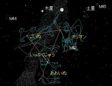 代表格としては、オリオン座、おおいぬ座、こいぬ座、ふたご座、おひつじ座、惑星も土星と木星の輝きが増し、とっても見頃となっています。 ![]() 1.季節の星座・・・オリオン座