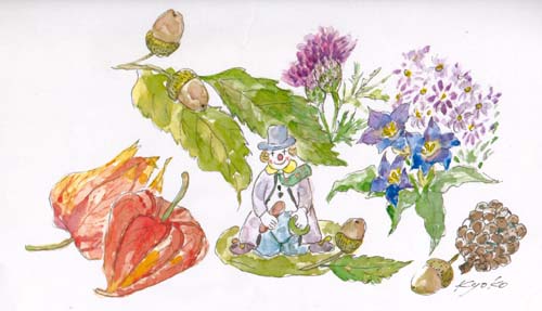 様々な植物が秋の風景を演じております。秋分の日、筑波山に登りました。稲刈りが終った所が目立って、ついこの間まで緑一色の里山がすっかり秋景色となり、山道には、あざみ、りんどう等の青紫の花々がひっそりと咲いていました。秋の花は探さなければ見つからない奥ゆかしさがあります。つゆくさの青い小さな花に宿る“露”は秋の季語になっていますが、秋冷の朝露が朝日と共に消えてしまうはかなさは、やがて華やかな紅葉の季節に移る序曲のように見えるのです。 ![]() 私の故郷への絵手紙を見てくれる友人から台風15号の松戸への接近でNO15号のぶどうは大丈夫でしたか?(もうお腹の中ですかね)という便りがありましたので、その後のぶどうの顛末を一言。もうそろそろ食べ頃と袋から収穫しようとしたら、袋の横を切り裂いて中身をしっかり盗み食いされていました。都会のカラスが私の上手をいっていて、がっくりと言うよりあっぱれでした。カラスの目の届かない鉢植えのぶどうは美しく実りました。