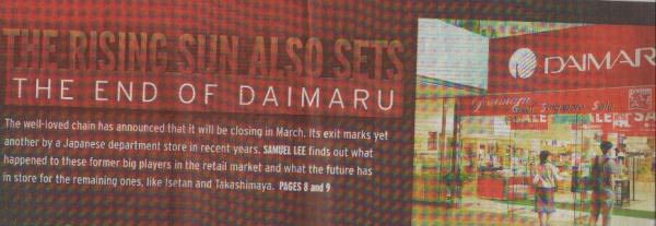 数ある日本のデパートの中でも、大丸は別格で、シンガポールの中の小さな日本そのものでした。特にスーパーはたこ焼きからお刺身、手作り豆腐におからまで、日本の食べ物で無い物は無いほどの品揃えです。いいか悪いかは別として。オンラインでお豆腐一つから配達を頼めるのも日本のデパートならではのサービスでした。日曜日は家族で大丸に行き、紀伊国屋で雑誌を見て、地下の和食レストランでランチを食べ、スーパーで日本食を仕入れて夕食は家で、と言うのが日本人駐在員ファミリーのサンデーライフと言われていました。 地元紙は見開き2ページ、カラーで「The Rising Sun Also sets」と題し、経済大国の栄華を誇っていた日本もこのところの不況に、撤退や中国へ移転する企業が相次ぎ、「日昇る国日本もついに沈む」とでも言いたげなタイトルで大丸シンガポール閉鎖についての特集を組んでいました。大丸シンガポール閉鎖はシンガポール人にも驚きだったようです。 ![]() ![]() 私は駐在員ファミリーではありませんが、さしあたり大丸撤退後はあの手作り豆腐屋さんはどこに行ってしまうのだろうと、そんなことを心配しています。