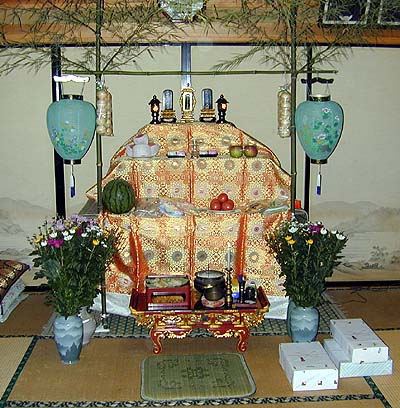 お盆である。わが家では、私が小さいころから、このような盆棚をつくり先祖を供養する。数年前までは柴田町の農村では、どこの家でもこのような盆棚をつくったが、年々省略する家が増えているらしい。じつは私の家でも省略しようと数年前から父と話をしているのだが、なぜか盆が近くなると父が準備するのである。