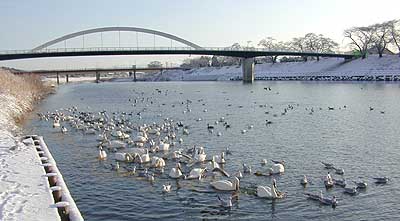 さくら歩道橋(3径間連続補鋼アーチ橋)が完成し、3月7日(水)午前10時から開通式が行われる。橋長181m。アーチ部分は60m。開通式の渡り初めでは、福祉劇団「鶴亀」を先頭に町の各自主団体が行列をつくり、新世紀最初の慶事を盛り上げるらしい。あまり大きい声では言えないが、当日の参会者に記念タオルを無料配布するとのこと(自主団体で作成・数に制限あり)。