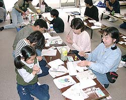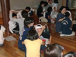 最近、アウトドアブームの中で起きてしまう様々な事故を耳にする機会が増え、その度危機管理能力が問題となる今日この頃。そこで、自然の中で起こりうる事故の防止と対処を知ってもらうため、柴田消防署の協力を得、「野外応急手当講習会」を開催。まずは、危険な動植物の知識と事故に遭ったときの対処法、次に火傷や骨折の応急手当と三角巾の使い方(写真1)、最後に、保護者対象には心肺蘇生法(写真2)、子どもたちには、自然観察時の準備についての学習会を実施しました。講習会終了後、「竹を使った器づくり」(写真3)を行ったところ、普段、刃物を持つ機会の減った子どもたちも竹の特性を学びながら器用に箸を作っていました。出来上がった人から順に自分で作った器に冷やしうどんを盛りつけ、竹箸で食べたのですが、子どもたちの顔がその美味しさを物語っています。(写真4)うどんを口に運ぶとき、ほのかに香る竹の香り、ほとんどの人が初めての体験だったようです。(講師:柴田消防署職員、宮城県森林インストラクター・応急手当普及委員)