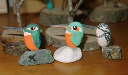 柴田町の豊かな自然を観察すると同時に歴史を学ぶ企画。この日は、加えて工作も行う予定でいましたが、柴田おもしろ探検隊始まって以来の本格的な雨。朝から中止にするかしないか悩んだ末に、「雨の日は雨の日の自然が観察出来るのでは…、」という期待から実施を決定。天気予報では、午後から雨が止むとのことだったので、午前中を工作、午後を自然観察とし、雨のあがることを願いつつ、活動を開始。工作は、「豆で鳥を作ろう」ということで、観察地で見られるカワセミを作ることにしました。豆を胴体に、爪楊枝をくちばしにし、色付けしたものを小石の上に付けるという簡単なものです(写真1)。中には、余った時間を利用してヤマセミ・フクロウ等を作った人もおり、大人も子どもも自分の力作(写真2)に満足げでした。また、続けて行われた「縄文土器の模様付け体験」では、粘土で作った器や皿に手で綯った麻縄を押しつけ、表面を転がし、縄目模様のミニチュア土器を作りました。最後に柴田町内で出土した土器片と比較したところ、中には縄文人になれそうな作品もあり、ビックリ。昼食後は、小雨が降る中、子どもたちが楽しめるようにと企画された「五感を使った観察会」(写真3)を実施。体験した内容の極一部を紹介すると、1.酸っぱいスイバの茎をかじる(味覚)、2.アカネの根を掘りだして紙に擦り付け色の変化を見る(視覚)、3.クサギやサンショウ等の葉のにおいを嗅いでみる(嗅覚)、4.土ガエルに触ってみる(触覚)、5.ニホンカモシカの食痕を見る(視覚)でした。また、これと並行して観察の道すがら館の跡や古道に関する歴史の説明を受け、昔の人々の生活を想像することでより一層柴田町が身近に感じられた一日でした。(講師:宮城県森林インストラクター)