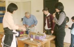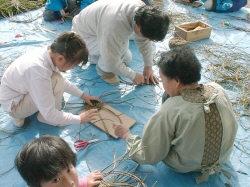 工作で使うツルや木の実などの材料は、ネイチャーゲーム「宝探し」(自然の中の材料を宝物に見立てて捜すゲーム)をしながら採集。午後からは、ドングリや葛ツル、竹を利用した小鳥(写真3)、ツル細工(写真4)、竹笛、木の葉のカード(写真5)、トンボ玉づくり(写真6)の他、除伐材にケーキ種を塗りつけ焼いていくバームクーヘンづくり等盛りだくさんの企画を自分の好きなブースにいって体験しました。
