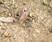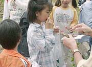 昨年に引き続き、「第2回 森の学校」を開催。今年は、柴田町との共 催で行われました。この日の活動は、自然観察や工作を通して、森の仕組 みや大切さを楽しみながら学ぶという目的で実施。午前中の自然観察会は、館山の散策路を2時間程かけて歩き、アケビ・グミ・ガマズミ・ケン ポナシ・ムカゴを摘んで、次々と味見(写真1)、秋の味覚を満喫しました。普段、木から直接取って食べる経験の少ない子供たちは、甘い、酸っぱい、渋いとそれぞれの感想で大いに盛り上がっていた様子。また、これらの木の実が、森に住む動物たちの大切な食べ物であることも学びました (写真2−リスの食痕)