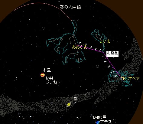 5月は、夕空に惑星が大集合しています。 5/3 【憲法記念日】 5/4 【国民の休日】水星が東方最大離角 0.4等級、離角約21度、視直径約8秒 土星と火星が再接近 5/5 【こどもの日】 5/6 【振替休日】 下弦 〔立夏〕太陽黄経45度 みずがめ座η(エータ)流星群が極大02:00(母彗星はハレー彗星!) 5/12 新月 5/20 上弦 5/21 〔小満〕太陽黄経60度 5/26 満月 半影月食になる(19:13〜22:54) 5/28 星見会定例会開催 (午後7時30分から一時間位 太陽の村屋上です。どなたでも望遠鏡で見られます。) 3.ちょっとためになる物知りコーナー・知っていると自慢できるかも! [星座の探し方] おおぐま座の探し方は、北と思われる方角に「北斗七星」ひしゃくの形を見つけてください。その、ひしゃくのえ(つかむところ)が熊の尾になります。さらにひしゃくを4倍したくらいの胴体があって、頭の部分がみっつの明るい星でかこまれて出来ています。胴体から手・足が伸びている星が見つけられれば「おおぐま座」の完成です。いかがですか? [北極星の探し方] 「北極星」とは、地球が回転している中心線の延長にあって、星が見えているときは位置がかわらないように見えるため、昔から船乗りたちがなにもない海で方角をさだめるたすけとしていた星です。この「北極星」はおおぐま座の北斗七星とカシオペア座から探すことが出来ます。ひとつめの北斗七星から探す方法は、ひしゃく星として七つの明るい星が「手桶」の形を作っていますが、おけ部分の2つの星をつないで5倍するところに北極星をみつけられます。 もうひとつの方法は、北の空にある「W」の形をみつけてください。これは、カシオペア座という星座なのですが、Wの両側の線をのばして交差させた点からWのまんなかの星をとおして5倍の位置に北極星がみつけられます。 ![]() [今日は曇りと安心?していたら‥4/23星見会報告]