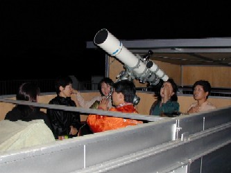 ◎ 6月11日、日本全国で日食が観測できます。 仙台での食の始まり(欠け始め)は、am6:48:03 最大に欠けるのは、am7:45:08 日食の終了は、am8:49:02 という予報です。 今回の日食は、日本の南方海上を金環日食帯がとおるため、日本でも部分日食として観測できるものです。 金環日食とは、太陽と地球の間に入った月が、やや太陽よりのため、地球から遠く見た目では太陽よりも小さいので太陽すべてをかくせず、全部かくれても太陽の輪郭がのこりリングのように見え、金環食といわれています。 【観測方法】 太陽を直接見てはいけません!まぶしくて目が見えなくなることがあります。安全に日食を観測するためには、特別な日食グラス(白黒フィルムを感光させて現像したものなど。)や市販のものなら大丈夫ですが、黒い下敷きやサングラスなどでは危険です。 直接見ないで観測できる方法があります。度数の軽い双眼鏡やオペラグラスで、白い紙などに投影して間接的に欠けているのを確認したりします。面白いのは、厚紙などに千枚通しなどで丸い穴をあけ、ピンホールカメラの要領でみると、三日月形に投影されます。 文字などの形に穴をあけて投影すると、その形に三日月形になり楽しいですよ! ※前に観測した時は、木々の木漏れ日が三日月形になっていたのが印象的でした。今回も見れるかも! 【図−ピンホール日食観測・1997年9月9日の日食にて】 ◎ 金星が超明るい! 夕方、西の空を見上げると初めて見た方は「あれは飛行機、UFO?」と思ってしまうほど、明るい星が美しく輝いています。これぞ金星・宵の明星でちょうど今太陽からの離隔が大きく見やすくなっています。金星の光度は太陽と月を除く天体では最も明るい−4等星です。 ゴ−ルデンウィ−ク中に月・水星・木星・土星との惑星集合ランデブ−が話題になりニュ−ス等でも報道されましたが、今も金星に次いで明るい木星(−2等星)が近くに見えており、たいへん見ごたえがあります。星のことがまったくわからない方でも見上げればすぐにわかりますので、ぜひご覧ください。 金星は古代から美の女神ビ−ナスの名で呼ばれてきました。明るく見えるのは金星の分厚い大気が太陽の光をよく反射するためです。その分厚い二酸化炭素の雲の下では硫酸の雨が降り、気圧が100気圧、気温が400度というすさまじい実際は「ビ−ナス」とはかけ離れた激しい過酷な星のようです。 |