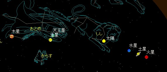 7/ 7 小暑 新暦の「七夕」月は出ず、暗い星空になります。 7/ 8 明け方の東の空で土星、月、水星が並ぶ。 7/10 新月 7/13 夕方の西の空で月と金星が並ぶ。金星はマイナス4.1等星 7/17 上弦 7/20【海の日】 夏の土用の入り 7/23 大暑 変光星:くじら座変光星・ミラが極大光度のころ 星見会定例会開催(第4・火曜日) (午後7時30分から一時間位 太陽の村屋上です。どなたでも望遠鏡で見られます。) ![]() 20020611日食の写真【H14.6.11太陽の村にて】 ![]() 3.ちょっとためになる物知りコーナー・知っていると自慢できるかも! ◎ 町史にもある日食観測 日本が欧化熱絶頂にあった明治20(1887)年8月19日、新潟県から茨城県にかけて本州を横断する皆既日食がありました。明治政府は、国の威信をかけ、官報にも「日食観測心得書」なるものまで発表し、専門家はもちろん一般人まで広く観測を呼びかけました。 全国70の一般人からの報告の中に、我が柴田町の先輩達の観測結果もあり、現在も東京天文台に保管されているとのことです。 柴田町の食分0.922の観測地点は、入間野村字寺山山頂(現在の槻木、東禅寺の裏山か?)で、太斎熊吉、坂田伝治、平間庄右衛門の3人が観測しました。(太斎、坂田は、入間野小学校の先生でした。) 柴田町での日食の様子を3人の観測記からみてみましょう。 「二時四十分頃ヨリ太陽次第ニ右ノ下ヨリ欠ケ、両角ヲ設ケ中ニ入レ込ミタリ、日ノ形ハ地面ニ映シル、淡白ニシテ且ツ寒サヲオボエタリ」 「此日ヤ午後ヨリ黒雲天ヲ蓋イ、漸ク進ンデ三時ニイタリ天俄カニ雲晴レ好天気ト変ジ、時ニ太陽已ニ六分四ヲ欠キテオリ、西南(の)山五色ヲ帯陽気燦然恰モ五色ノ地層ニ異ナラズ、而シ而シテ太陽ノ光ノ反射ハ西南山ニ表顕シタリ、是ヨリ漸ク欠ケ三時五十分五六秒ニ至リ四方暗ク欠ケ凡ソ九分九厘余ニシテ上方ニ終ル、此時ニ於テ二星、雲間ニ出顕シタリ、然レトモ何星タルヲシラズ」 八月十九日午後四時認ム 入間野村 この日は、観測者にとって必ずしも天候に恵まれたとはいえなかったようですが、三人の願いが通じたかのように、午後3時「にわかに好天に変じた」とあり、この時すでに4/6の食が進んでいました。 「西南(の)山五色ヲ‥‥西南山ニ表顕シタリ」は、どういう状況を説明したものかわかりませんが、西南山は、寺山から西南の方向にある館山(船岡城址)を示しているのでしょうか。 3時50分56秒が食の最大で、およそ9分9厘まで欠けて終わったとしています。 そして、この食の最大の間に、雲間から2つの星を見つけることができたけれども、なんの星わからなかったと記しています。 食の最大時ころ、太陽光が弱まって見えた2つの星は、何だったのでしょう。 当日、日食は、しし座で進行していて、この時刻、空には春の星座がひろがっていました。(日中ですから、当然みえません) 「雲間から」なので、全天のうちどの程度見える状況にあったかわからないので、なんともいえません。でも、この節、おとめ座には金星と木星がいましたから、日中でも確認できることのある、この2星ではないでしょうか。 ![]() 【1887.8.19 pm3:00の星座】