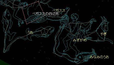夕方、暗くなるのが早くなってきました。空はすみわたり、シーイングも良く星空観察では絶好のチャンス!なのですが、秋は明るい星が少ないので、星座をさがすのがたいへんです。 頭の上には夏の星座の、白鳥座・こと座・わし座がまだ見られますが、南の空には明るい星がポツポツと見えている程度なのです。でも、よーく見ると中空のまんなかあたりに「Y」ワイの字形をかたむけたような小さな四つの星のかたまりが見えます。これが、みずがめ座の「かめのそそぎぐち」です。ここから、おなじくらいの明るさの星がつながっていて、水が流れているようすがわかるかな? 流れていった水が、またあつまってこんどは明るい星に流れこんでいます。これはみなみのうお座のフォーマルハウトという星なのです。 みずがめ座のまわりには、みなみのうお座・うお座・くじら座・尾がサカナのやぎ座・川の名前のエリダヌス座などがあつまっているのですが、これは、星座ができた頃の季節(雨期?)に関係があるのかもしれませんね! みずがめ座の星座名はアクエリアスといいます。アクアとは、水という意味ですが、水族館はアクアリウム、海にもぐるときの装置はアクアラングというふうに「水」に関係するものにおおいようですね。星座は、大神ゼウスが神々とえんかいをするときに、酒をついでまわる役のヘーベ(ゼウスとヘラの娘)のかわりにつれてこられた美少年ガニメデュース(ゼウスがワシの姿になりさらってきた。)といわれています。星座絵を見ると老人のときもあり、青年のときもあり、ガニメデュースは歳をとっていたのでしょうか?(神々は歳をとらないのに。) うお座は、美と愛の女神アフロディーテ(ビーナス)と、その子エロス(キューピット)がユーフラテス川のほとりを散歩していたとき、とつぜん出てきたティフォン(100の頭を持ちおそろしいうなり声をあげる怪物)という怪物におどろき、とっさにサカナに姿をかえユーフラテス川にとびこんでにげた姿とされます。星座絵では2匹のサカナが尾をひもでつなげた形になっているのは、母子をあらわしているのです。 同じはなしで、ずっと下に位置するみなみのうお座は深く逃げすぎたため深海魚(しんかいぎょ)のようなアンコウの姿をしているようです。 ![]() 【みずがめ座】 2.今月の星を見る会と、天文現象のスケジュール