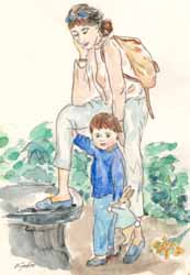 南フランス、カンヌの沖合、サント・マグリット島(鉄仮面の城塞)に行った時に見かけた母と子のスケッチ。片時も母親から離れないで、頼り切っている男の子。足にはピーターラビットが男の子にしがみついて、なんとも微笑ましい3人でした。