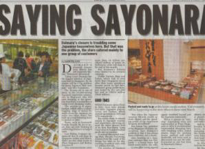 数ある日本のデパートの中でも、大丸は別格で、シンガポールの中の小さな日本そのものでした。特にスーパーはたこ焼きからお刺身、手作り豆腐におからまで、日本の食べ物で無い物は無いほどの品揃えです。いいか悪いかは別として。オンラインでお豆腐一つから配達を頼めるのも日本のデパートならではのサービスでした。日曜日は家族で大丸に行き、紀伊国屋で雑誌を見て、地下の和食レストランでランチを食べ、スーパーで日本食を仕入れて夕食は家で、と言うのが日本人駐在員ファミリーのサンデーライフと言われていました。 地元紙は見開き2ページ、カラーで「The Rising Sun Also sets」と題し、経済大国の栄華を誇っていた日本もこのところの不況に、撤退や中国へ移転する企業が相次ぎ、「日昇る国日本もついに沈む」とでも言いたげなタイトルで大丸シンガポール閉鎖についての特集を組んでいました。大丸シンガポール閉鎖はシンガポール人にも驚きだったようです。 ![]() ![]() 私は駐在員ファミリーではありませんが、さしあたり大丸撤退後はあの手作り豆腐屋さんはどこに行ってしまうのだろうと、そんなことを心配しています。