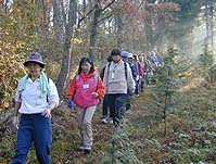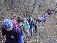これ以上ない好天気に恵まれ、午前7時に槻木文化センターを出発。四日市場炭釜から町東端の深山山頂へ。参加者の大部分が初めてのコース。グリーンピア岩沼との境界になる稜線漫歩を楽しみ、ヤブ漕ぎを行って、大鹿野林道から富沢の富上農村公園へ。富沢の磨崖仏群を見学し町最高峰の愛宕山を目指す。最後の急登にバテた人もいたようだ。入間田雨乞地区ではユズ湯をご馳走になり、紅葉真っ盛りのイチョウと収穫盛りのユズ林に歓声が湧く。