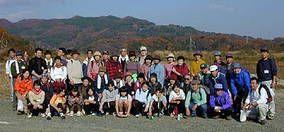入間田のホタルの里を見学し、池田さんの豆腐と油揚げ買いに殺到する参加者。分譲が始まった「ゆずが丘」の傍をとおり12時30分に農村環境改善センターに着いた。愛宕山をバックに記念撮影(集合写真)。イモ煮とビールで昼食。県道を歩きながら今日歩いてきた山並みを振り返り「自分を誉めてあげたい」と思った人が多かった。文化センターに予定どおり14時30分に着く。桜場実行委員長から参加者一人一人へ完歩証明書と地元産のキュウリとユズが手渡された。今年の参加者は48人で小学5年生から76歳。全員が完歩した。暖かい晩秋の町を多くの人たちと歩くことができ、ミレニアム年の満足できた一日になった