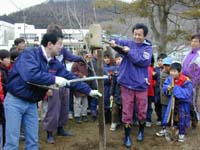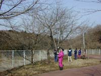 いよいよ、さくらのシーズン。柴田町さくらの会でも3月3、4、10日の3日間にわたり、これまで植樹した桜木の調査とテングス病の駆除(写真B)を行った。一年で一番好きな季節である。さくらの会では4月1日(日)に13年度の植樹を行う。船迫小学校の依頼で一足早く3月3日に、4年生の子どもたちと一緒に校庭に3本の植樹を行った(写真A)。 |