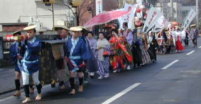 3月7日にさくら歩道橋の開通式が行われた。町の各種団体が集まり、福祉劇団「鶴亀」が中心になった仮装行列で渡り初めに花を添えた。写真@は開通式の宣伝のために役場前を練り歩く行列。先頭の駕籠は蔵王町から応援に駆けつけた「平沢羽前街道保存会」の皆さんである。当日は風が強く、橋の上に立っているのもままならなっかたが、羽山歩道橋の渡り締めも行った。いつものことであるが、仕掛け人は柴田町の怪物“菊地真一”氏である。仕事を休み、さくらの会として参加した。楽しかった。